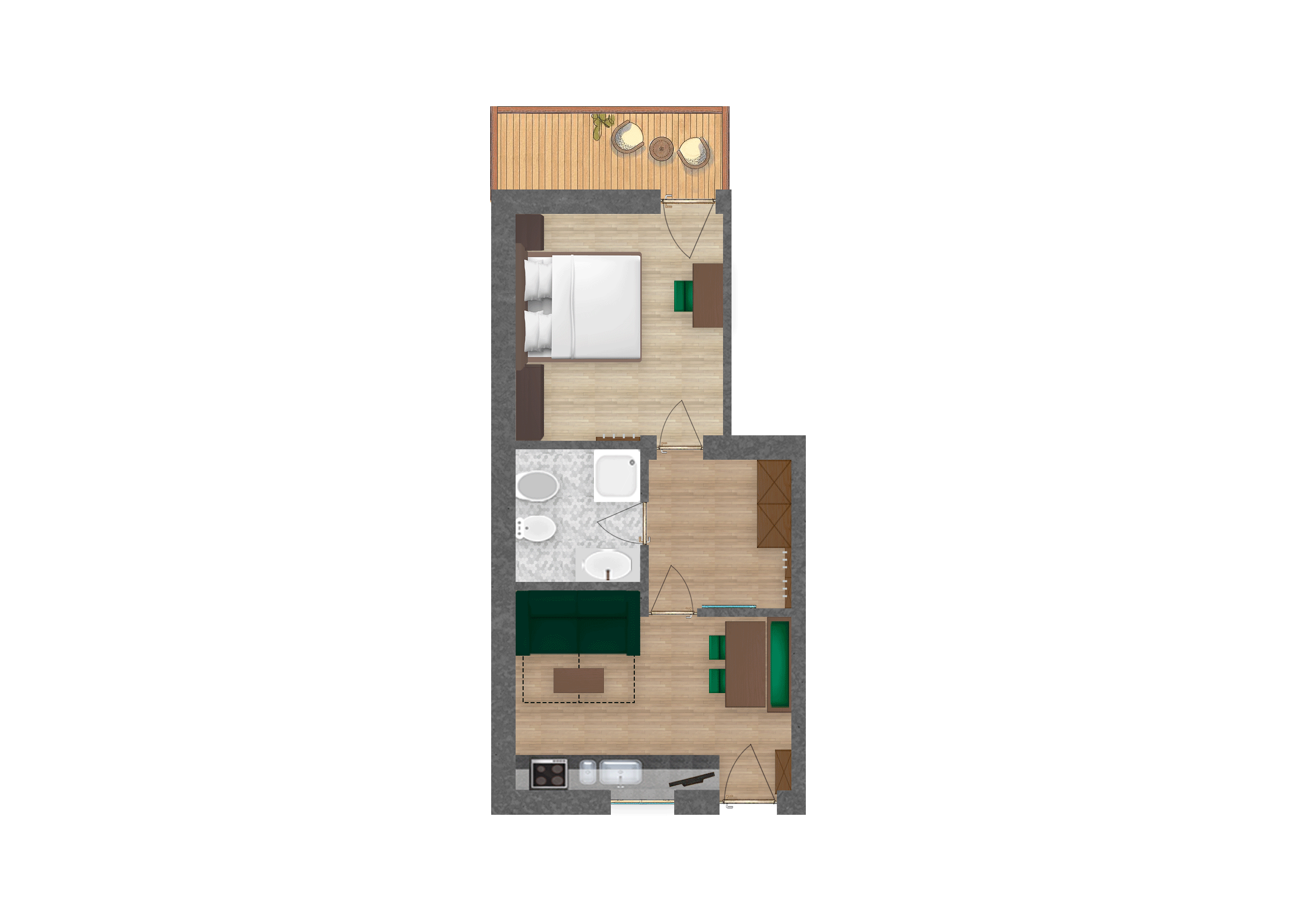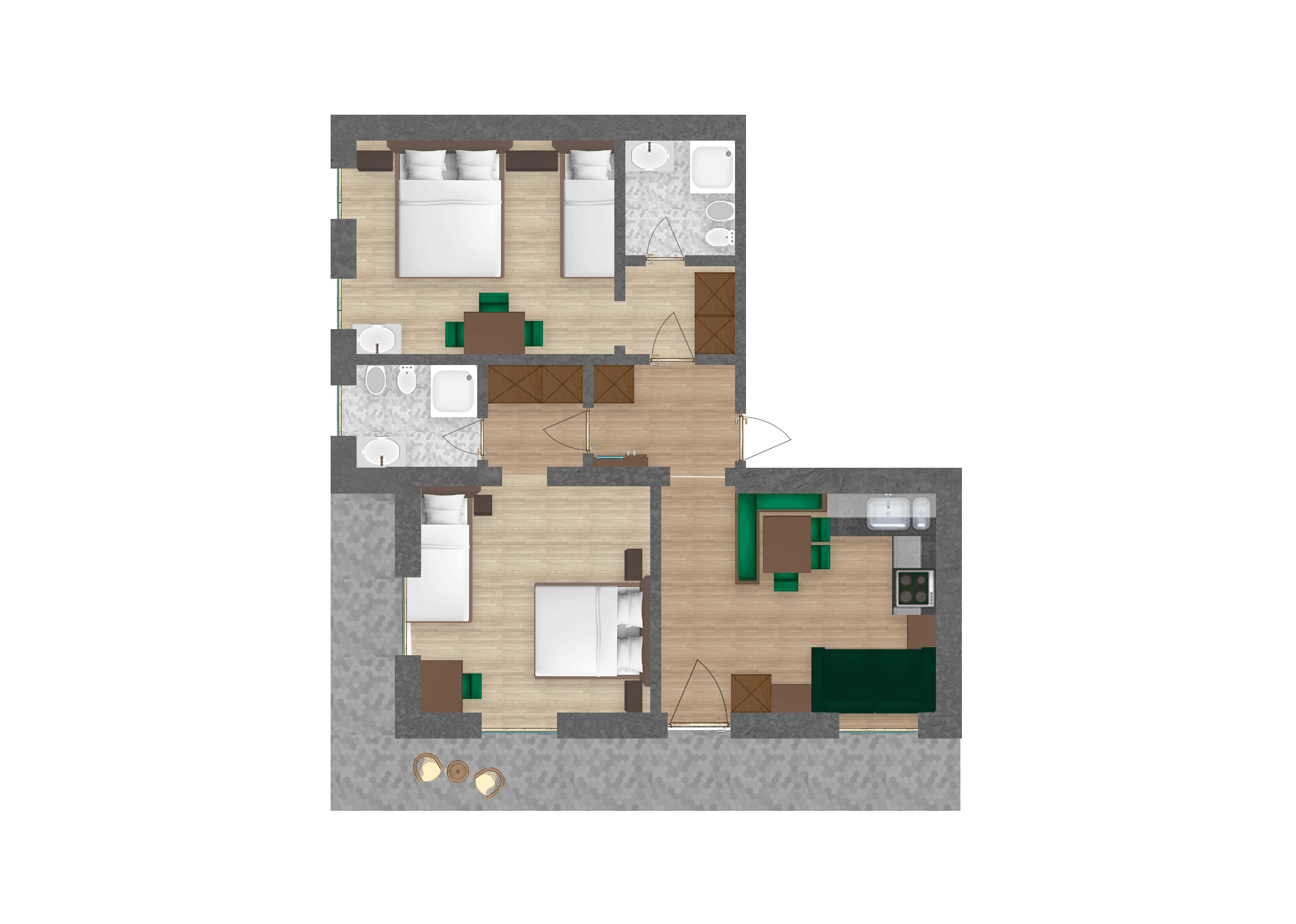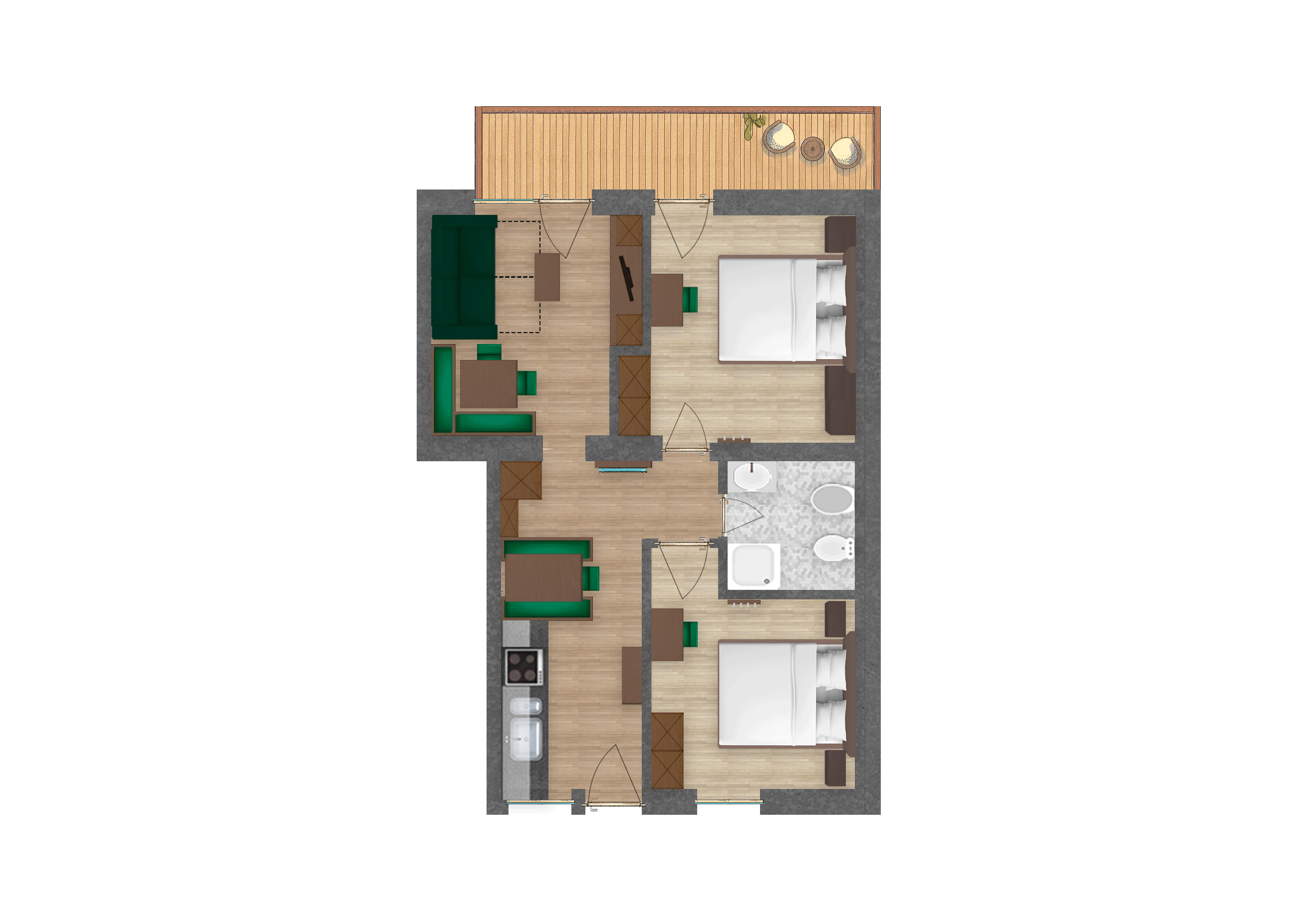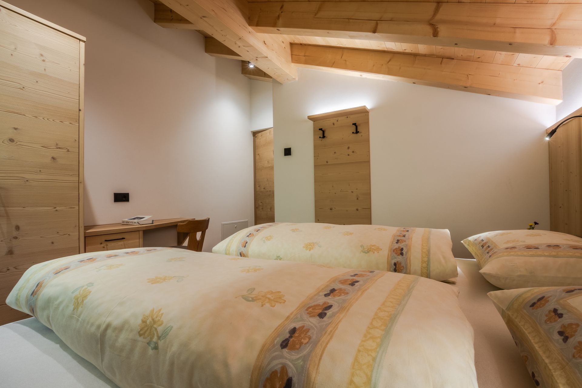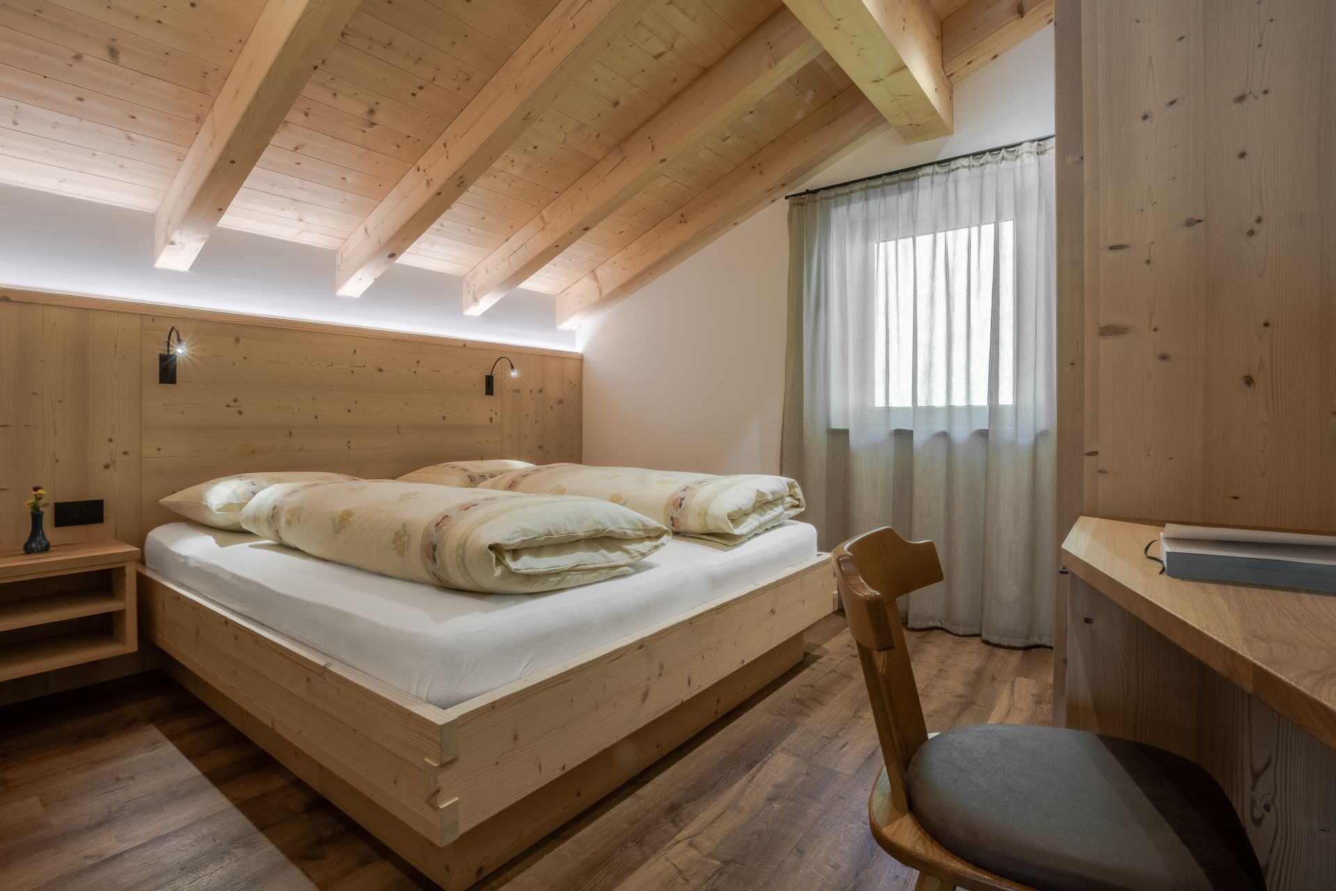 L'appartamento Peció (abete rosso in ladino) è situato al pianterreno. Misura 72 mq e può ospitare 2-6 persone. È composto da 2 ampie camere triple, ciascuna con bagno privato, area soggiorno con angolo cottura completamente attrezzato, tavolo e tv satellitare. In bagno sono presenti, doccia, bidet, wc e phon.